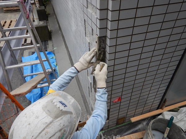 劣化診断を実施し、エポキシ樹脂注入やピンニング、張り替えにより長期に亘りタイルの剥落を防止します